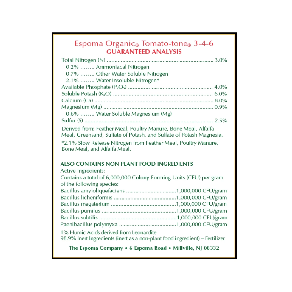 Tomato-tone is a premium plant food formulated specifically for growing plump and juicy tomatoes. Tomato-tone’s organic composition feeds your plants naturally and will not force rapid growth at the expense of blooms and tomato yield. Tomato-tone’s all natural formula contains Bio-tone®, our proprietary blend of beneficial microbes. Bio-tone biologically enhances our natural plant food to ensure superior plant growth.