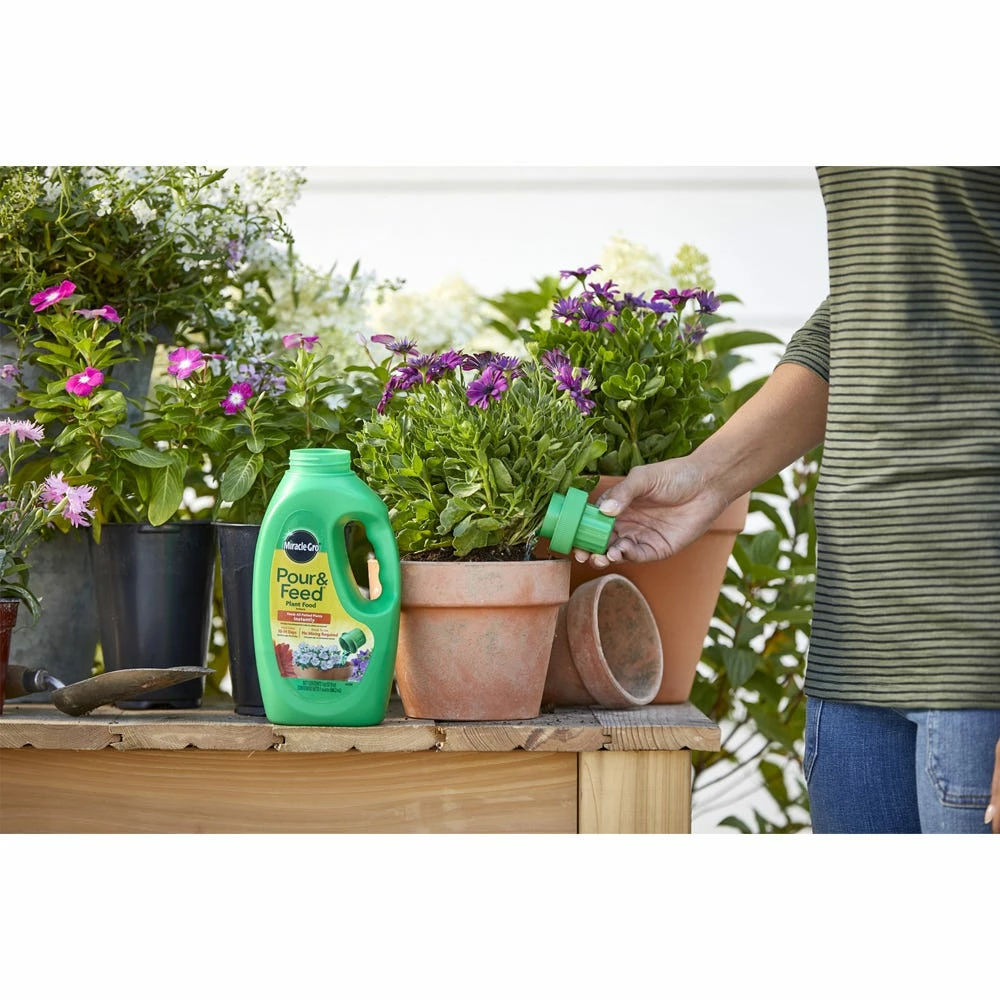 Instantly feed all potted plants with Miracle-Gro Pour & Feed Plant Food. This ready-to-use plant food is applied directly to the soil—no mixing with water is required. Feed plants in outdoor and indoor containers every 1-2 weeks and enjoy strong plants with the help of Miracle-Gro.