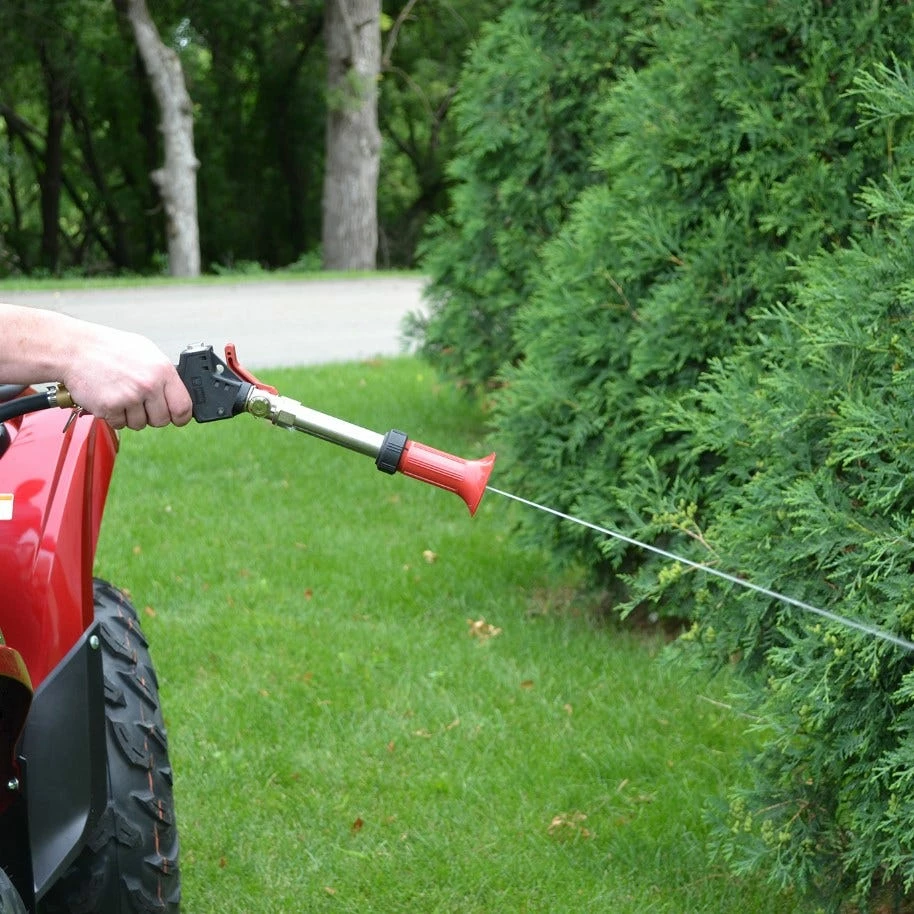 Reach new heights with the Valley Industries Universal 2200 Series Adjustable Flash Spray Gun. This quick grip, one-handed spray gun can handle up to 700 PSI & 15.0 GPM. Featuring a thumb lever on the side of the spray gun that goes from a steady stream to a wide mouthed atomized mist. Prevent unwanted chemicals with the no-drip shut-off at the end of the barrel. Adjust to your pump volume (2.4-5.5GPM pumps), use included interchangeable nozzles to maximize pump performance. Depending on the size of the diaphragm pump in-use, spray up to 18-35 feet vertically and 20-45 feet horizontally.