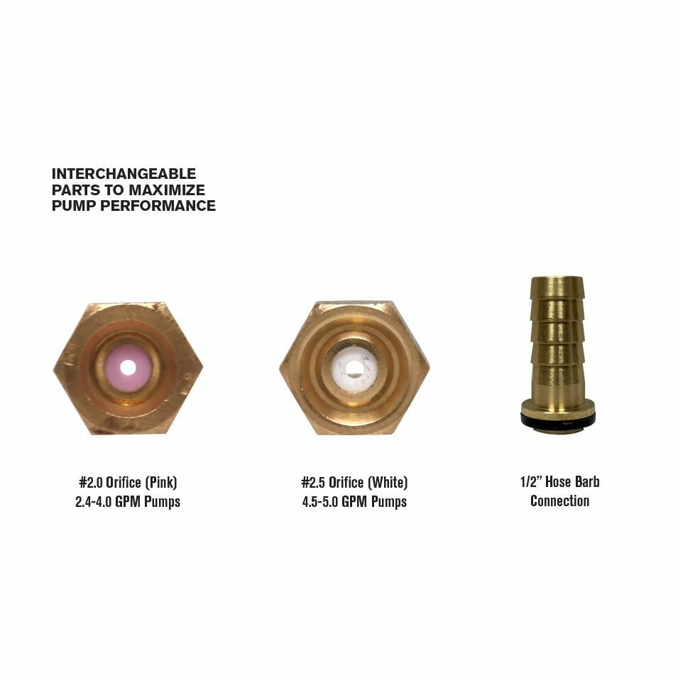 - Includes two hose barb fittings for easy sealed connections to 3/8” or ½” rubber hose